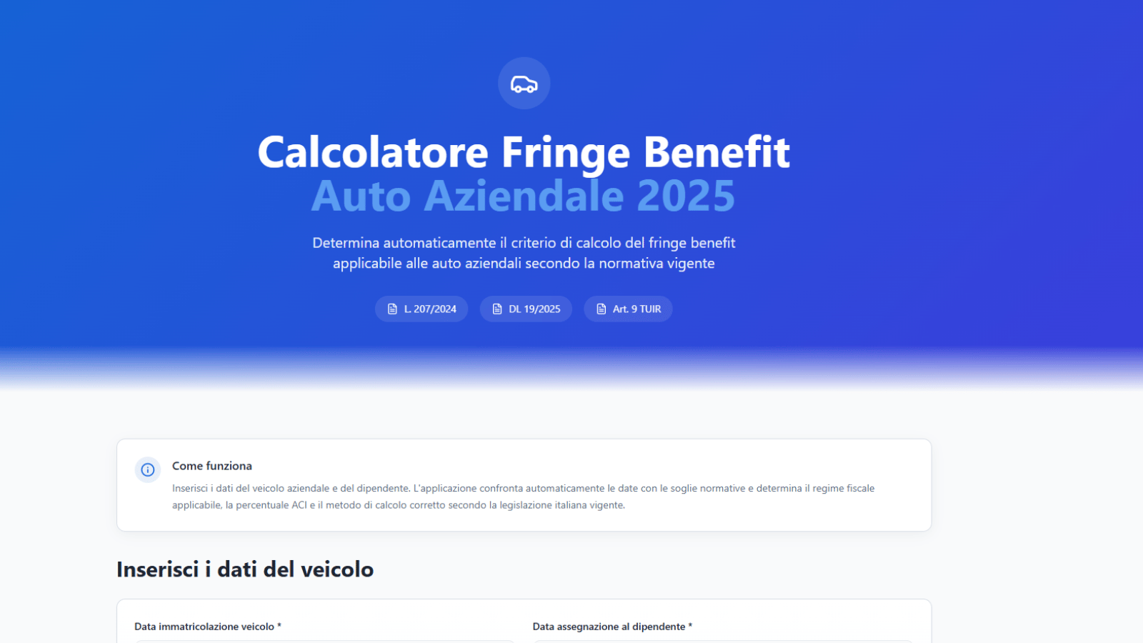 Il 2025 sarà ricordato dai professionisti del lavoro e del fisco come il momento più complesso per applicare le giuste regole al calcolo del fringe benefit per le auto concesse in uso promiscuo ai dipendente. Questo tool di calcolo può farti individuare la giusta modalità di tassazione.